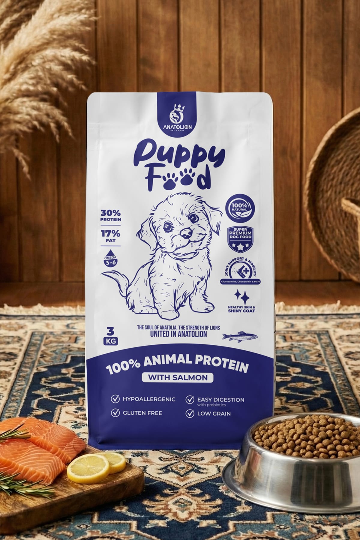Anatolion Super Premium Somonlu Yavru Köpek Maması, yavru köpeklerin hızlı büyüme döneminde ihtiyaç duyduğu yüksek kaliteli besinleri dengeli şekilde sunar. %30 ham protein ve %17 ham yağ oranı ile kas gelişimini desteklerken, somonun doğal omega yağ asitleri sayesinde cilt sağlığını ve tüy parlaklığını artırır.